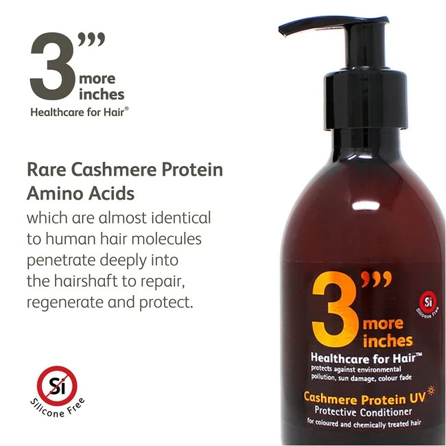 - 3”’More Inches Cashmere Protein UV Protective Conditioner helps repair the hair so it grows stronger, more supple and shining with health