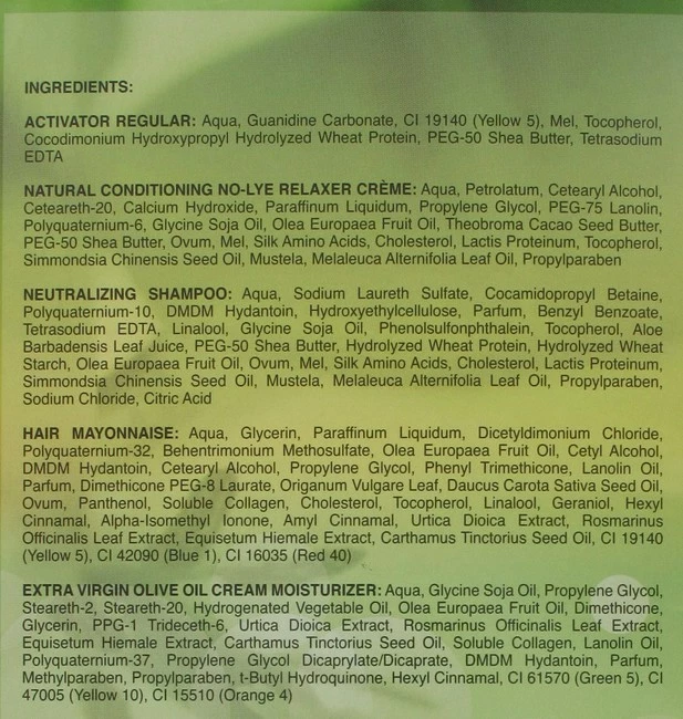 This system formulated with extra virgin olive oil no lye super. Organics is the first organic conditioning no-lye relaxer. This relaxer is a all-natural conditioner that moisturizers and strengthen hair that is gentle to your skin and scalp during the hair treatment relaxing process. It helps to restore silky soft, healthy strait hair.