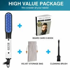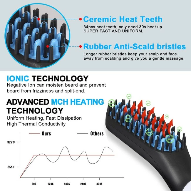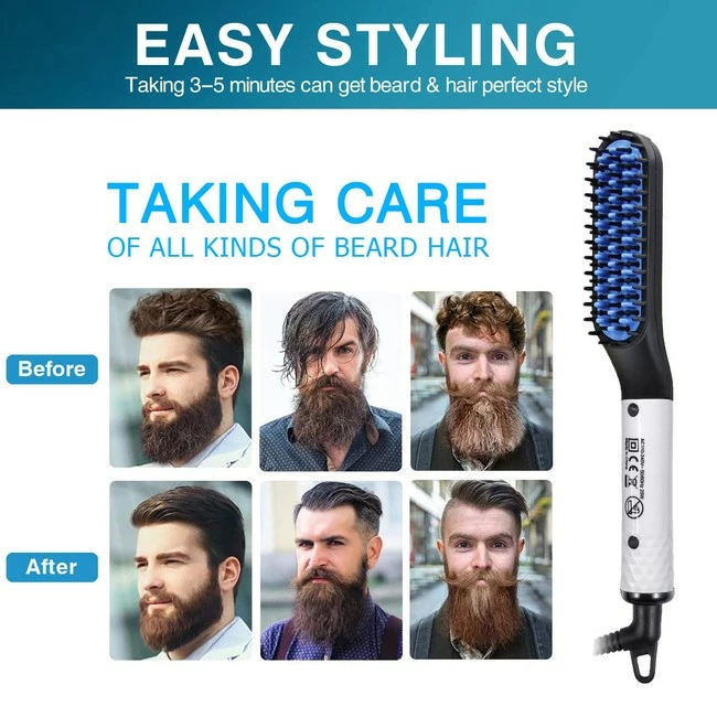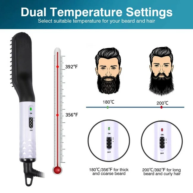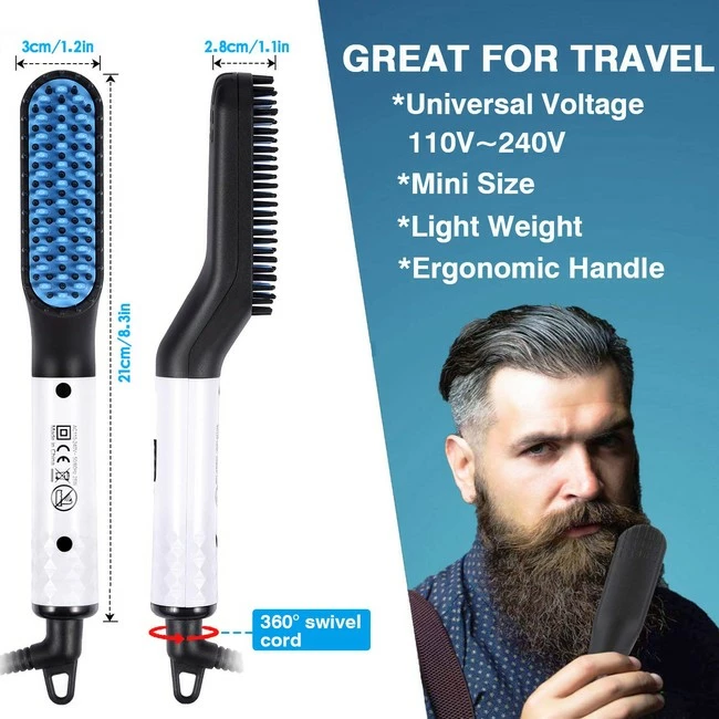 Are you still upset with taking much time to tame your messy beard every morning? Are you still having difficulty with messy beard during travel ? Our beard straightener comb for men will change a lot for you ! **Why choose our Beard Straightening Brush? ** โ TWO-year warranty and friendly customer service (24/7). Free replacement or 100% refund within 24 hours. โ Reliable beard Straightener Brush: Take latest technology, More than 100,000 person enjoy our beard straightening brush for men! โ Metal ceramic Heating & Safe Anti-scald design: Ensures faster uniform heat diffusion and prevents damage to your hair & Skin. โ Time Saver: 30s quickly heat up, only 3-5 minutes to style your beard / hair. โ Ionic Technology: ensure every strand of hair is pulled straight and get a healthy, polished look. โ Two Temperature Modes: Low-temperature(180โ/356โ) for thick or coarse beard / High-temperature(220โ/428โ) for long beard and curly hair. โ Universal Voltage: Compatible with voltage range 110-240V. โ Ergonomic Handle & 360ยฐ Rotating Power Cable: Operate easily without tangling. โ Mini Size and Lightweight: 1.26*8.27inch and 7.41oz, In addition, offer a custom velvet bag portable for travel. **Mini multifunctional hair comb beard straightener Instruction: ** 1. Dry the beard fully prior to using heated beard comb. 2.After 30 seconds heat up, slowly stroke through the hair and beard, from roots to the ends until desired smoothness is achieved. Multiple strokes through the same strands will not damage the hair. 3.After using the beard straightening comb, turn it off and cool it down before attempting cleaning. 4.Use the small brush to clean beard straightening brush, keep it way from water.