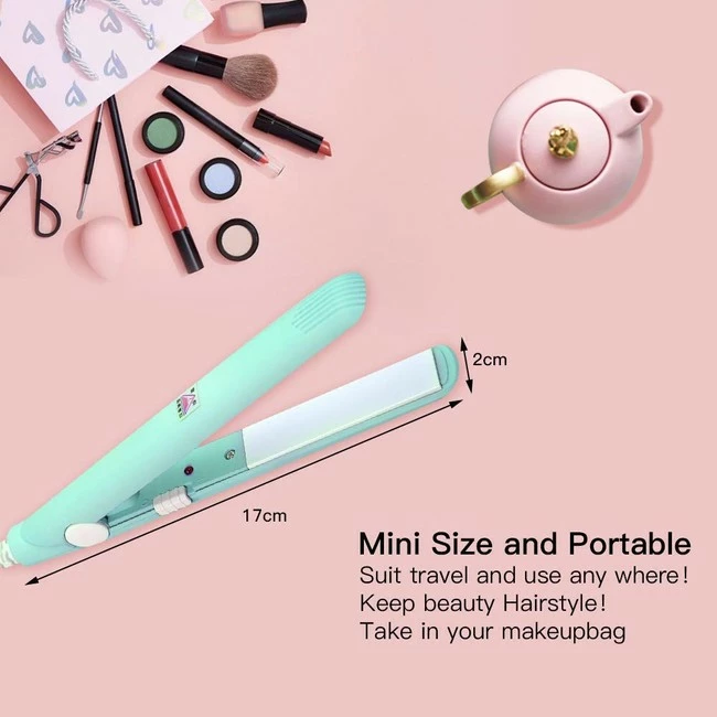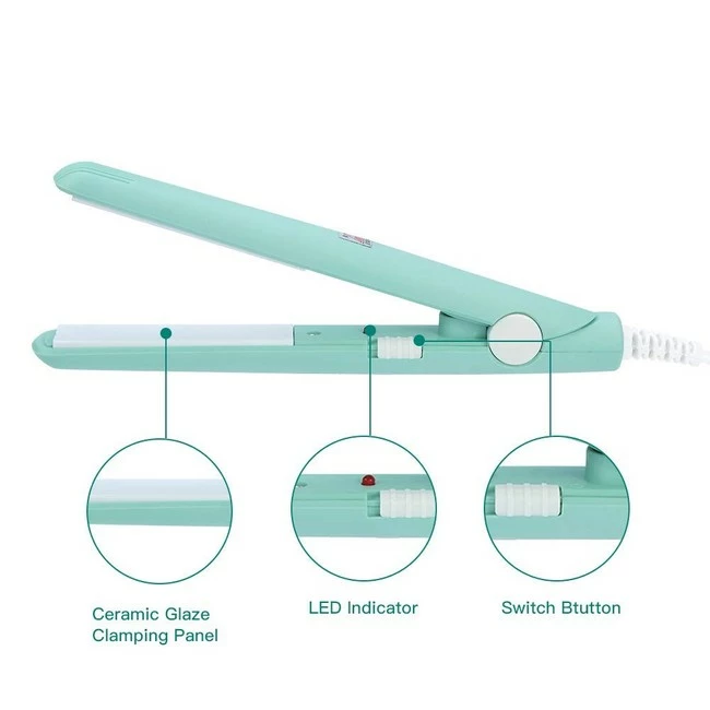 Features: 1.3D floating plate, 30s temperature rising, even heat distribution, quick hair styling, long lasting effect. 2.Seamless design of the up and down panels for grasping every hair, so that there is no hair dropping and pulling. 3.Ceramic tourmaline plates enable smooth pulling motion without breaking or damaging to hair. 4.Smart 190โ temperature keeping function can prevent your hair getting over heat or your scalp from getting hurt. 5.Emits negative ions leaves hair smooth, silky, frizz-free and safe. Mini size, lightweight, it fits your bag or suitcase easily for travel use. 6.2 in 1 hair straightener is perfect not only for curly hair but also for straight hair, specially for see-through bangs. Specifications: Material: Tourmaline Ceramic + Plastic Heating Element: PTC Power Rate: 25W Frequency: 50/60HZ Voltage: AC 110V Working Indication: Red LED Lamp Optional Colors: Purple, Matcha Green, Sky Blue, Pink Styling Time: 1-2mins Constant Temperature: 190โ Item Size: Approx. 170 * 20mm / 6.7 * 0.8inch Heating Panel Size: Approx. 70 * 17mm / 2.8 * 0.7inch Package Weight: Approx. 150g Item Type: Hair Straightener Package Include: 1 x Hair Straightener 1 x Manual Instruction Note: 1.Please do not allow the item to contact with water. 2.Avoiding contacting your skin with the high-temperature product surface. 3.This item is only suitable for dry hair. 4.Dear customer, Please rest assured to buy without worrying about the plug adaption. We will provide an adapter for you according to different country standard and ensure its normal use.