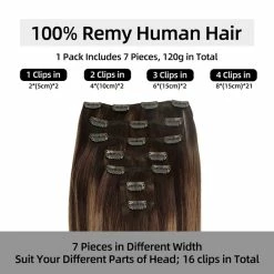 - Clip in Hair Extensions Specification: Remi human hair clip in extensions. 7pcs 120g sets: 105g net weight for hair without clips; 120g for hair with clips. The clips is secure enough for your hair. Usually 1 Packs is recommended for customers who have fine type of hair to add length & volume or 2 packs if you like thick hair