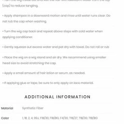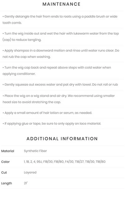 * Gently detangle the hair from ends to roots using a paddle brush or wide tooth comb. * Turn the wig inside out and wet the hair with lukewarm water from the top (cap) to reduce tangling. * Apply shampoo in a downward motion and rinse until water runs clear. Do not rub the cap when washing. * Turn the wig cap back and repeat above steps with cold water when applying conditioner. * Gently squeeze out excess water and pat dry with towel. Do not roll or rub the hair into a towel. * Place the wig on a wig stand and air dry. We recommend using smaller head size to avoid stretching the cap. * Use heat appliances only when hair is completely dried. * Apply a small amount of hair lotion or serum, as needed.
