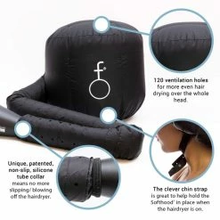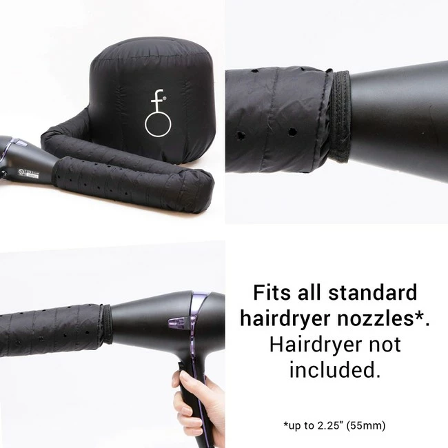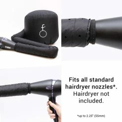 - Unique, patented, non-slip, silicone hose collar, fits hair dryer nozzles up to 2.25″ (5.5 cm). Must be used on a low heat setting. Hairdryer not included.