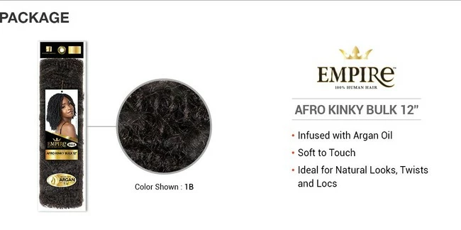 **Sensationnel Human Hair Braids Empire Afro Kinky Bulk 12″** FEATURES ARGAN OIL INFUSED SOFT TO TOUCH IDEAL FOR NATURAL LOOKS, TWISTS, AND LOCS For Hair, Thatβs Stunningly Soft Crown Yourself with Argan Oil Infused EMPIRE – 100% Human Hair from Sensationnel. Argan Oil protects against the heat of hairdryers, curling irons, and flat irons; tames frizz and flyaways, all the while maintaining a healthy shine.