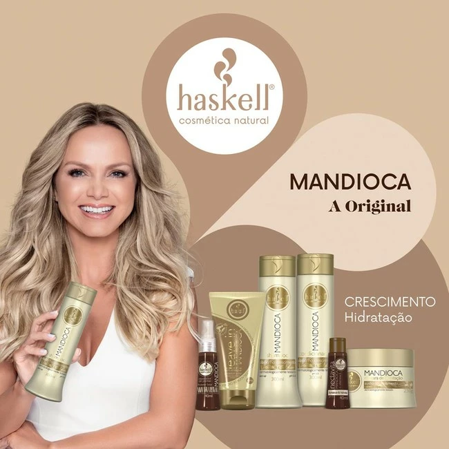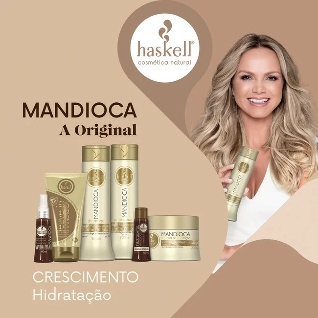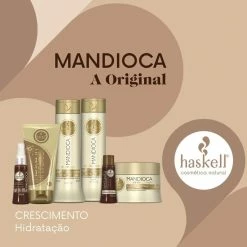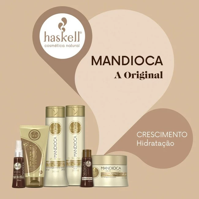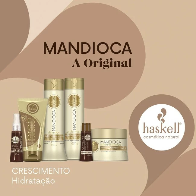The extract of the cassava leaf, rich in nutrients, associated with silicone and pro-vitamin B5, acts on the hair protecting and favoring a prolonged conditioning. ————— O extrato da folha de mandioca, rico em nutrientes, associado ao silicone e pró- vitamina B5, atua nos cabelos protegendo e favorecendo a um condicionamento prolongado.