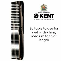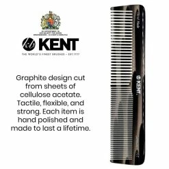 KENT 16TG Dresser Comb: 7.2 Inch Large Black Graphite finish. ABOUT KENT’S HANDMADE COMBS: Kent Handmade Combs for Men and Women Range are of excellent quality. Kent hand sawn combs are cut from large sheets of cellulose acetate rather than moulded, producing a truly gentle comb whereas moulded combs often snag and damage the hair. This material is tactile, flexible and strong. They glide effortlessly through hair without scratching to damaging the hair or scalp. Kent combs have rounded teeth which ensure a smooth and comfortable action. The range includes designs for thick and fine hair, in varying sizes, for both men and women. About Kent: Founded in 1777, Kent Brushes is the world’s oldest hairbrush manufacturer and has maintained its British traditions of producing the world’s finest hairbrushes and combs ever since. Making the best quality brushes for over 230 years and creating over 250 products. Quality, design and attention to detail go into each brush. They have been the holders of The Royal Warrant through the last nine consecutive reigns of British monarchy. The company continues to retain the craftsmanship and unprecedented quality that is Kent’s reputation.Even in today’s fast moving, mass-produced assembly lines, they are proud to still be manufacturing many of their original brushes by hand.