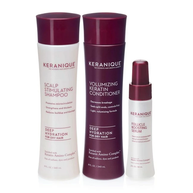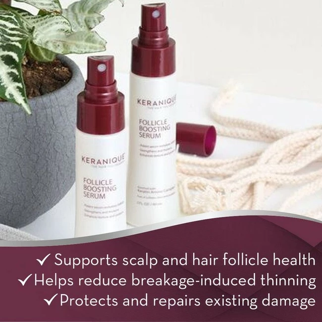 PROTEIN-BASED: Powered by the Keratin Amino Complex Protein, the 60 Day Hair Boost Kit will add volume and thickness to each strand, and will nourish each follicle to help promote thicker, fuller hair.. SCALP STIMULATING SHAMPOO: Thinning, fine hair that is prone to breakage needs a special shampoo. Our shampoo is designed especially for thinning hair to gently deep clean and stimulate the scalp to nourish and rejuvenate the hair follicles.. VOLUMIZING KERATIN CONDITIONER: Our conditioner is a special cream-gel formula with a fortifying complex that coats, protects and volumizes fine and thinning hair with a keratin enriched coating. It will help with manageability, detangling & conditioning without weighing the hair down, and still adding body and volume.. FOLLICLE BOOSTING SERUM: Our follicle boosting serum is a weightless, alcohol-free serum utilizes cutting-edge skin and hair ingredients; fortified with Peptide and Stem Cell technology to address thinning hair directly at the follicle and helps strengthen the hair. Use every day to increase the look of thickness and volume over time. Hair will look visibly denser, fuller and thicker..