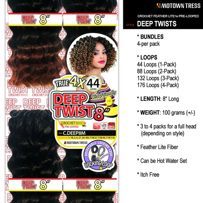 **C.DEEP8M DEEP TWIST – 44 Loops – 8 inch by Motown Tress** – Crochet FeatherLite Locking Loop Deep Twist..