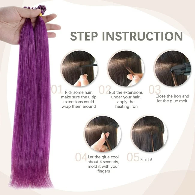 U-Tipped fusion hair extensions have a nail-like end which are heated and wrapped around strands of your own hair .It is also known as hot fusion extensions, is a popular way to enrich existing hair with added volume, length and texture. Pre bonded with keratin tips, u-tip extensions are to be applied with a hot hair extension iron.Unlike other types of extension, u-tips are the most popular and oldest method because of their unnoticeable capabilities, which allow the hair to move and flow naturally.How to apply u tip hair extensions1.To install the extensions, your hair should be 5 inches (12.7 cm) minimum so that the attachment points are visible. The extensions are applied 5 mm from the scalp.2.Select a thin strand of hair using the tail of the comb,insert the lock of hair in the template circle to protect the scalp.3.Use hot extension iron to heat the pre-tipped extensions to natural hair, your hair is fixed to the original lock expansion on heating point of keratin.4.When the keratin is not transparent, it is rolled between your fingers so the extension and natural hair is uniform.5.Repeat the same steps to put the locks one by one across the head.6.In the end, the hair is brushed lightly to blend so harmoniously with the natural hair extensions.Restyled1.The hair extensions are made of 100% real hair, it can be washed or cut as your own hiar.2. It can be dyed to darker color only,please use one strand to test first.3.Temperature is better below 356 ℉/180℃ when you heat it.Color Difference:All the pictures are taken by Runature Hair,due to the light and pixel,it may has a little difference.