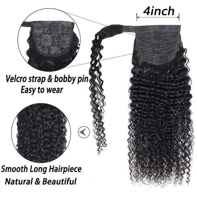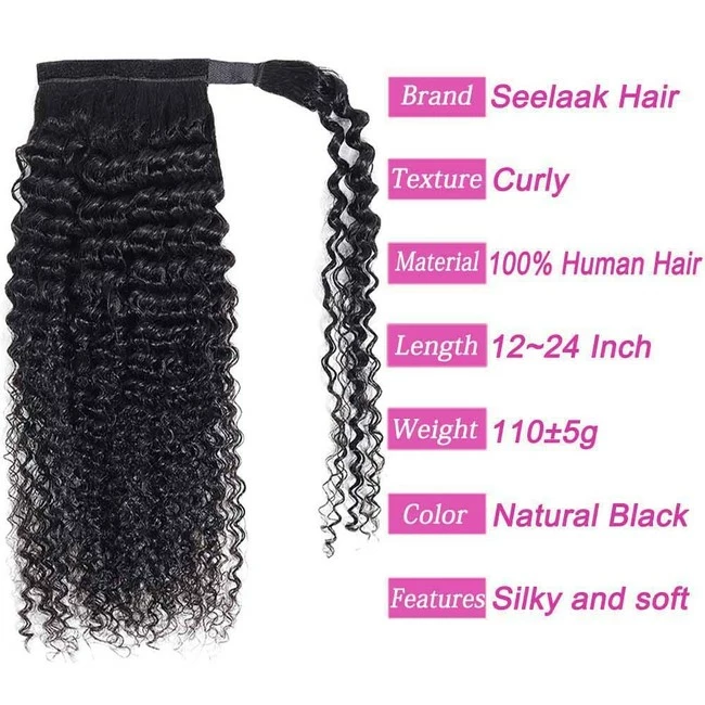 Seelaak 16 Inches Curly Hairpiece Wrap Around Ponytail Hair Piece with Clips Human Hair Ponytail Extensions 100g/set Magic Paste Binding Pony Tail Hairpiece for Black Women by seelaak