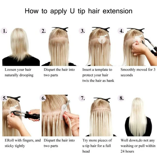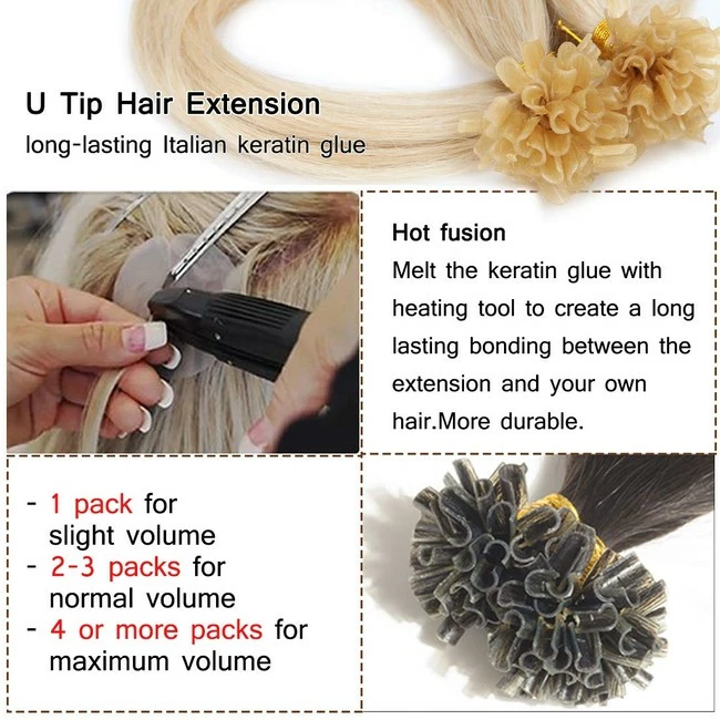 - U tip keratin hair extensions human hair,use of hot fusion.Keratin glue is gentle for hair and provide a long lasting bonding which still allows the hair to move naturally.The u-tip attachment is thin and virtually undetectable,can be customized by cutting it to 2-3 smaller bonds for fine hair. We advise professional application and removal.